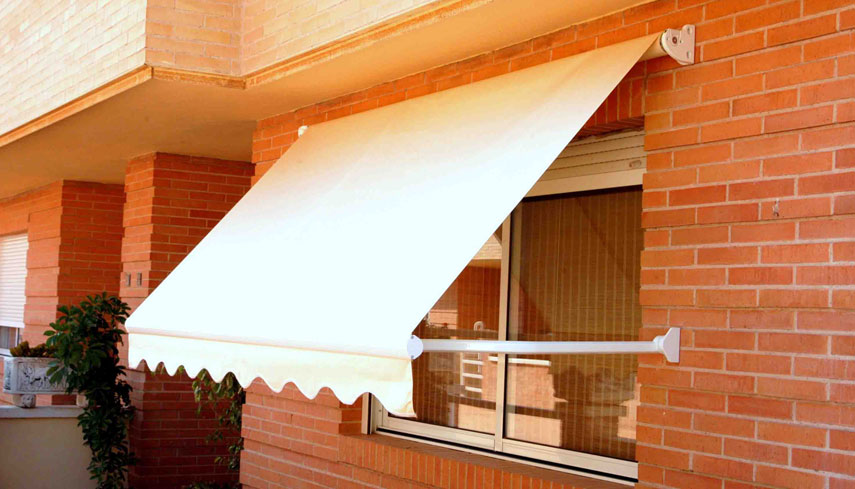 Sistema clásico de toldo para ventanas. Sus brazos, perpendiculares a la fachada, bajan en un movimiento circular logrando una amplia e íntima sombra.